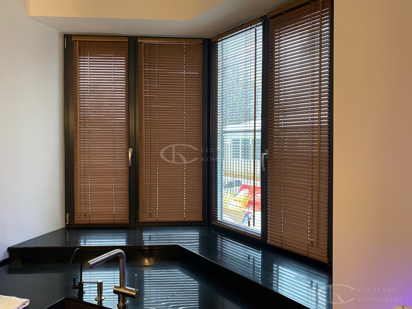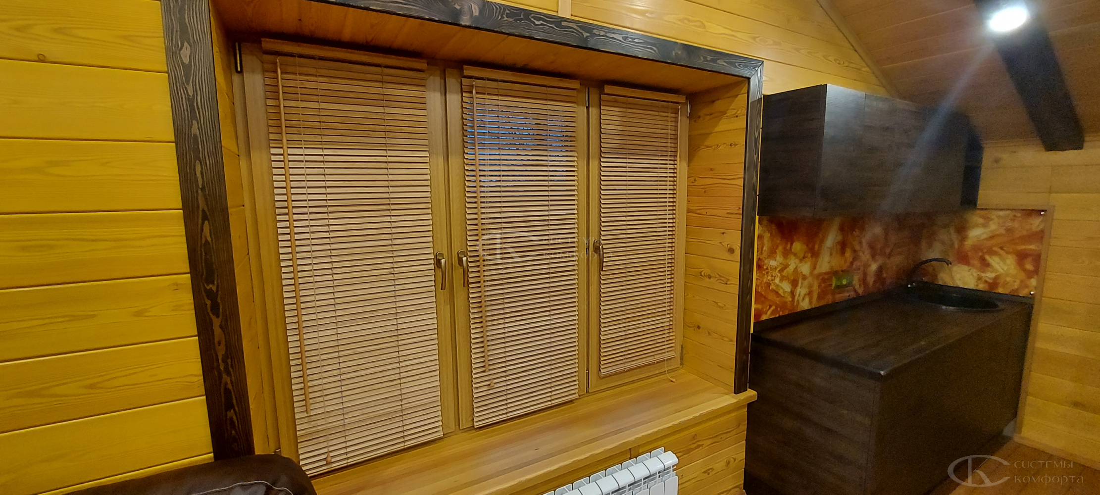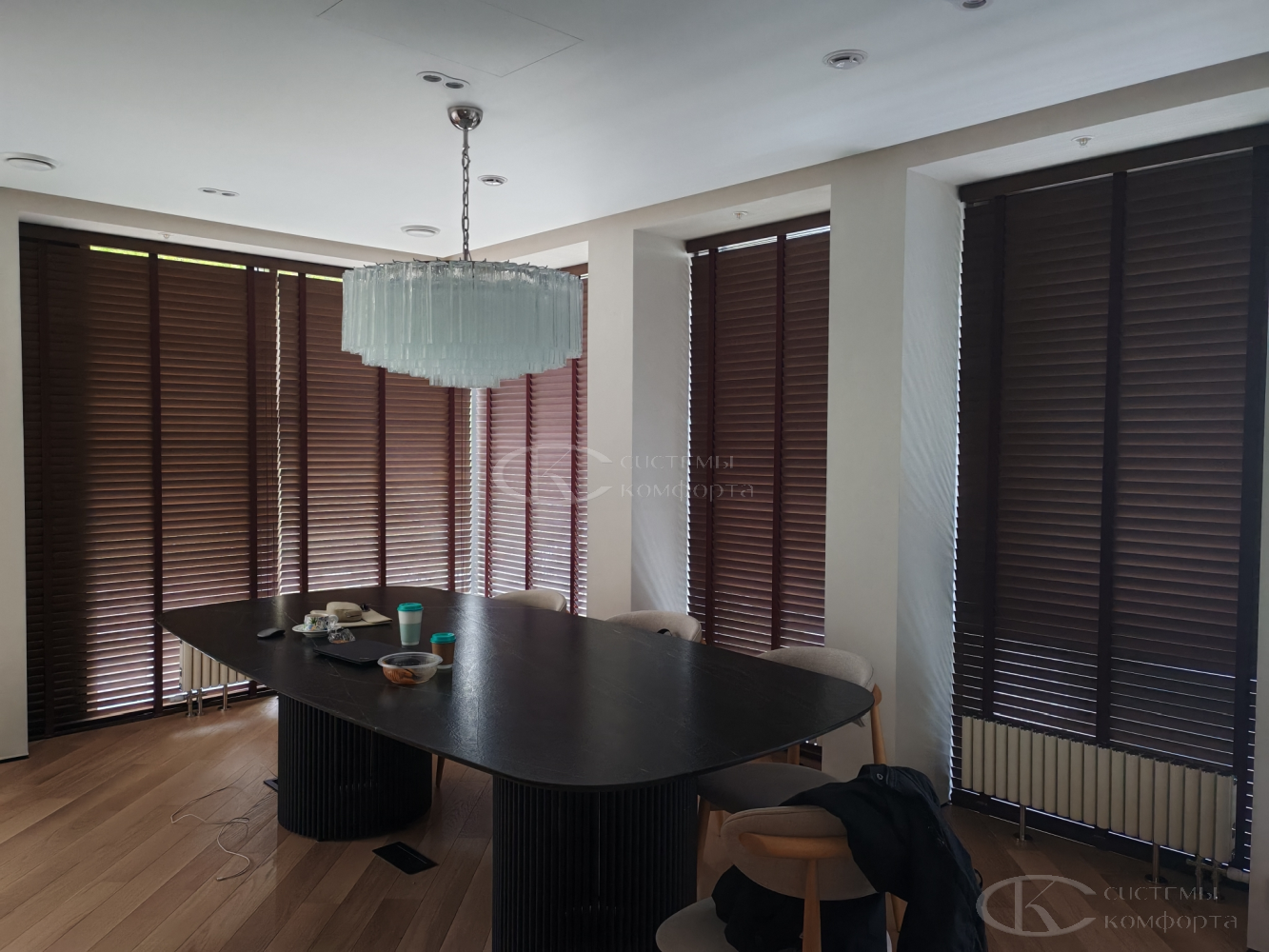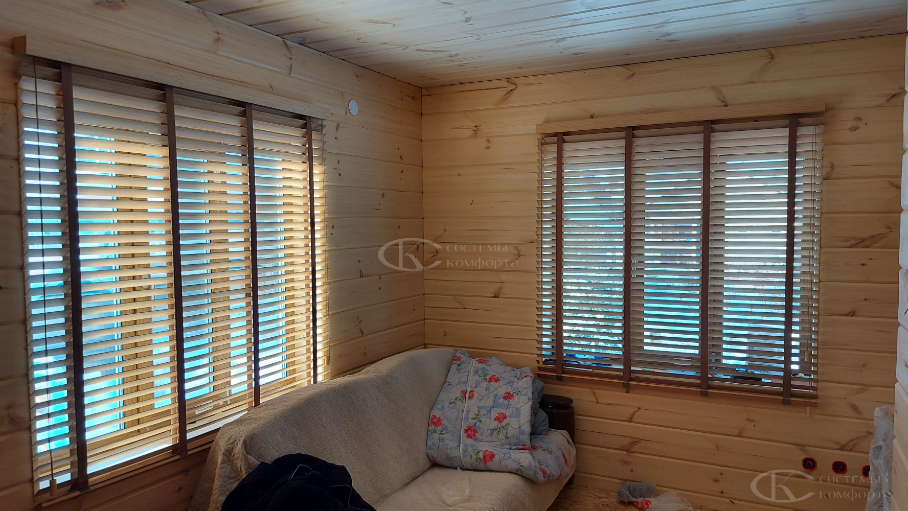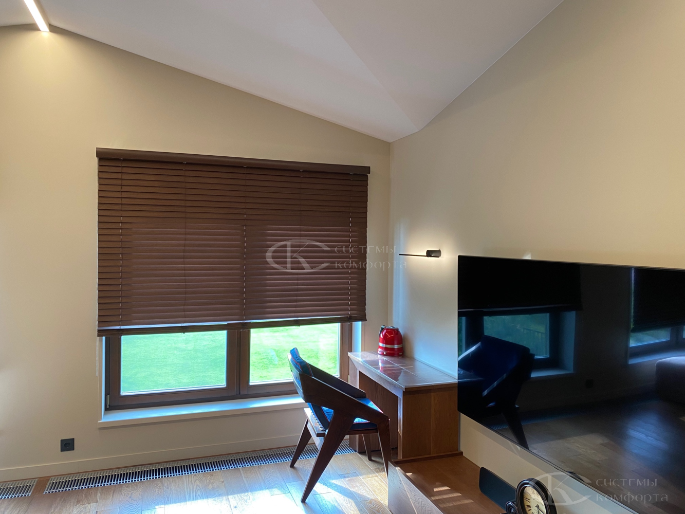 - Деревянные жалюзи. Аристократия среди жалюзи. Они создают в комнате особенную атмосферу тепла, уюта и экологичности. Такие жалюзи для дома отлично подходят для гостиной, кабинета или спальни в классическом или эко-стиле. Важный нюанс: для помещений с высокой влажностью (ванная, неотапливаемая дача) лучше выбрать бамбуковые модели – они более устойчивы.