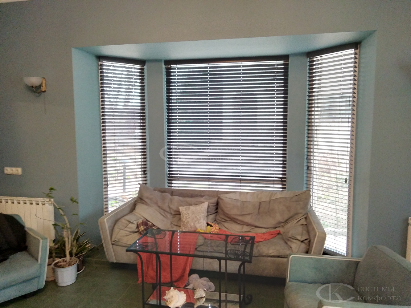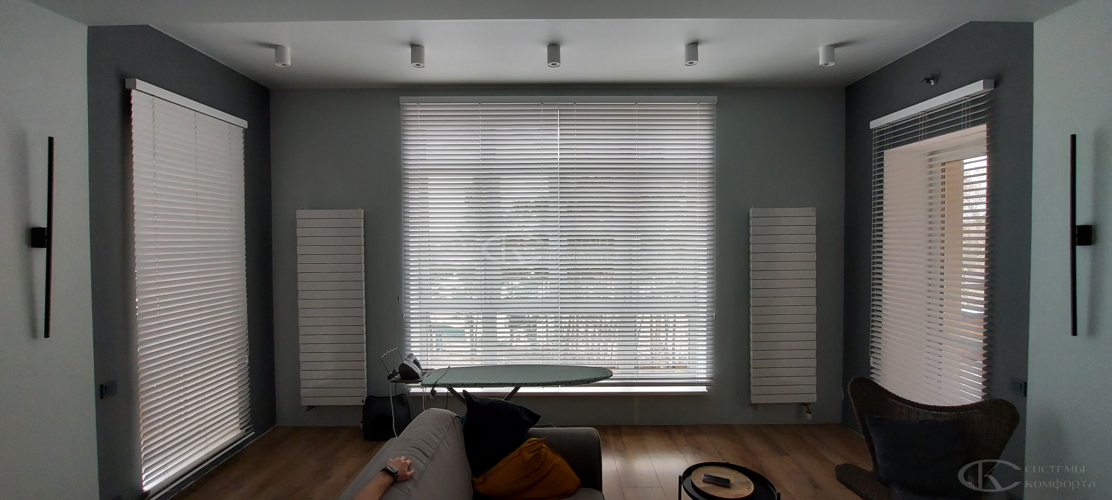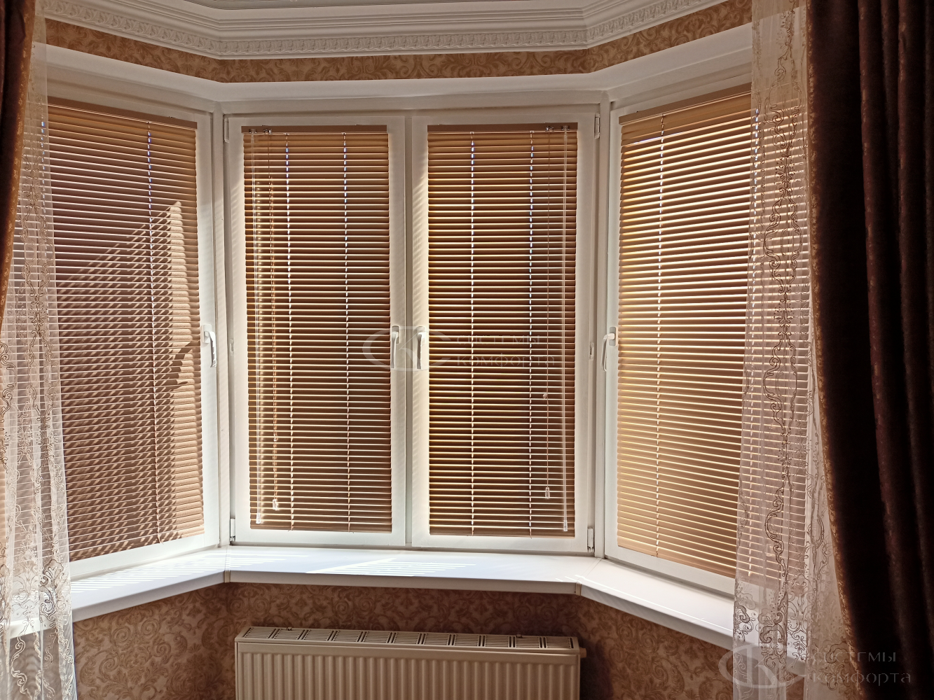 - Тип системы. Горизонтальные алюминиевые – наиболее бюджетный вариант, деревянные, римские шторы или системы с электроприводом будут дороже.