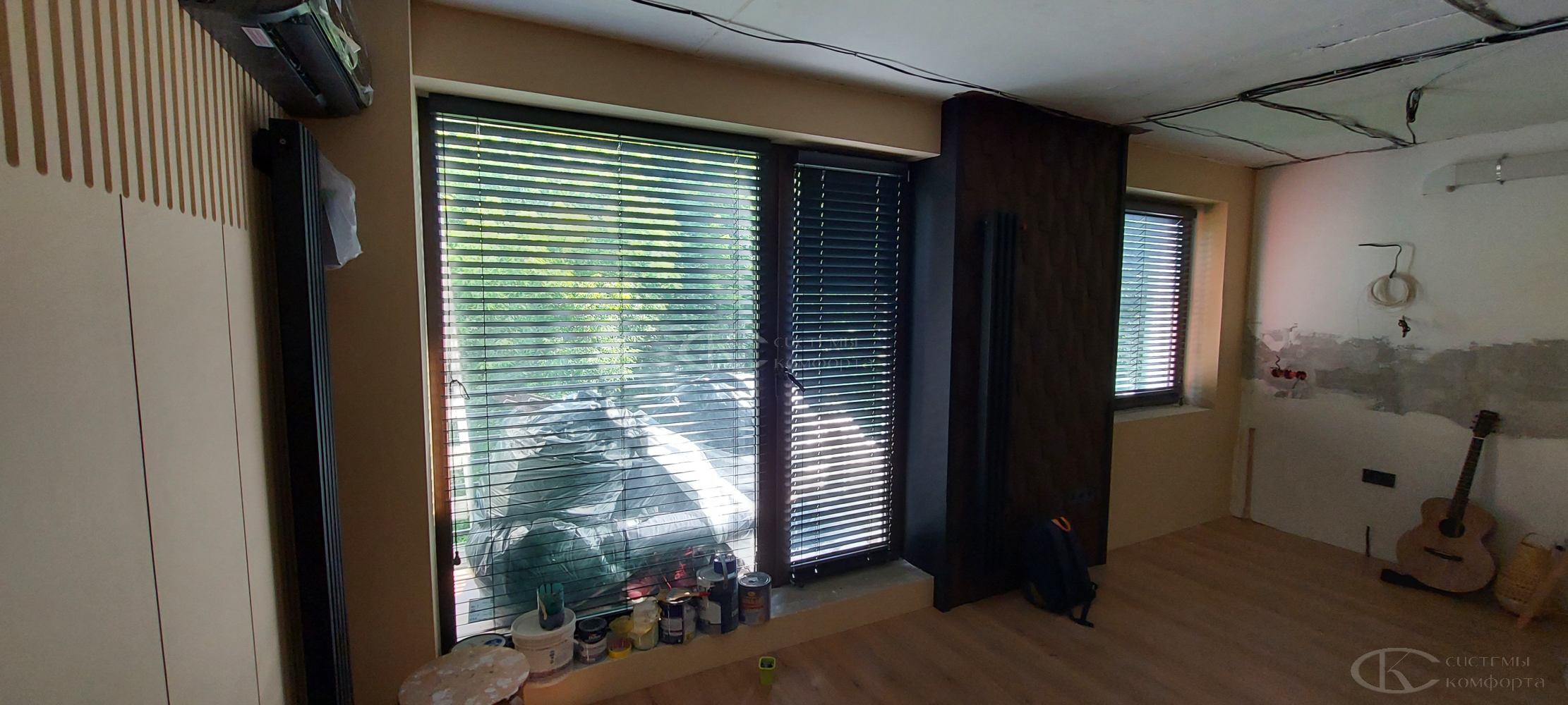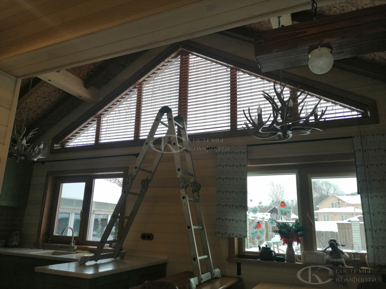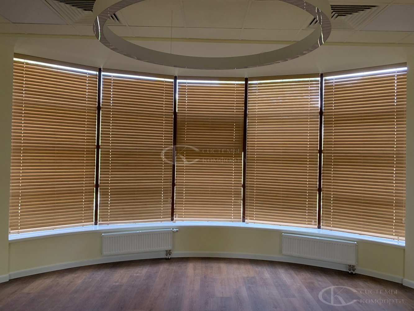 - Тип системы. Горизонтальные алюминиевые – наиболее бюджетный вариант, деревянные, римские шторы или системы с электроприводом будут дороже.