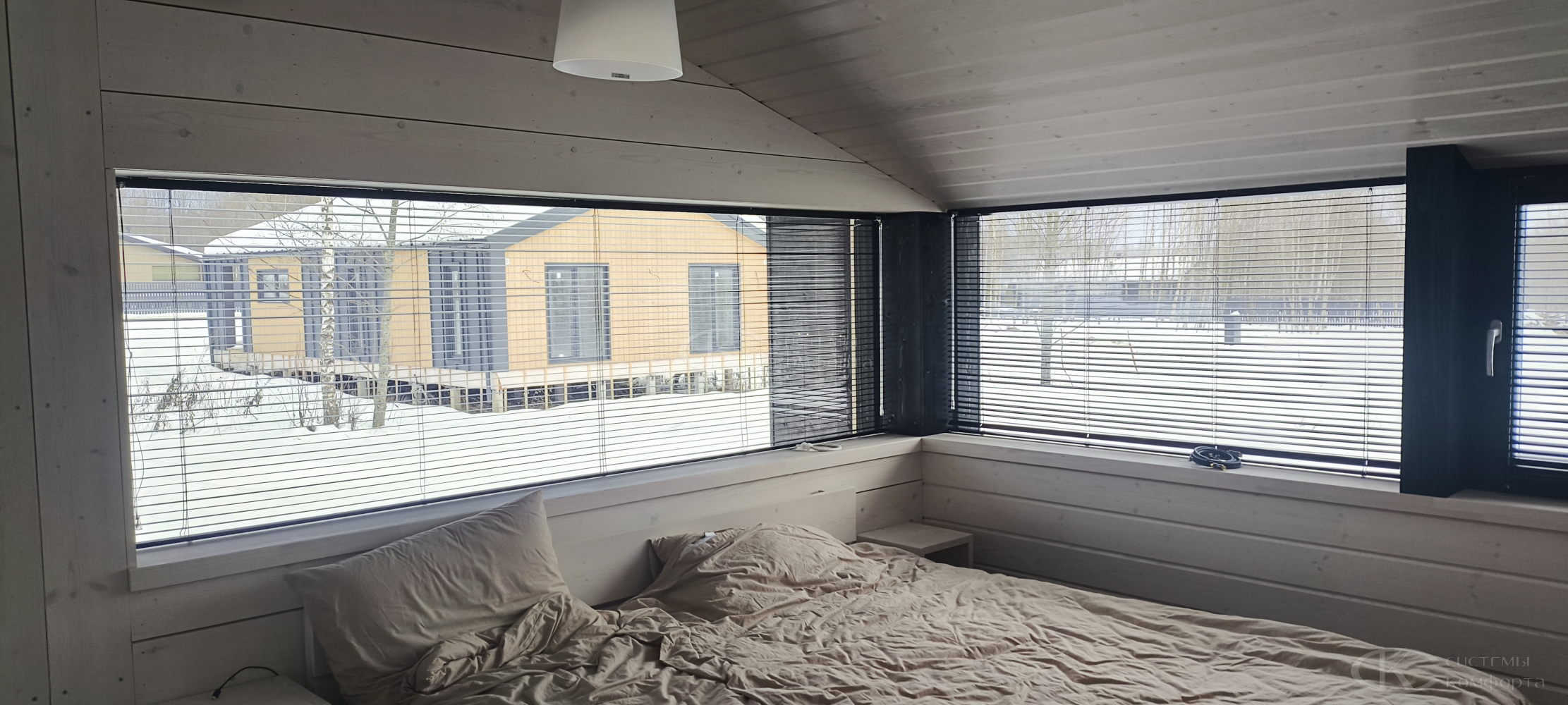 Это тот самый знакомый всем образ: аккуратные горизонтальные ламели на тонких лесках или тросиках. Но современные горизонтальные жалюзи для частных домов ушли далеко вперед от стереотипных «офисных» моделей.