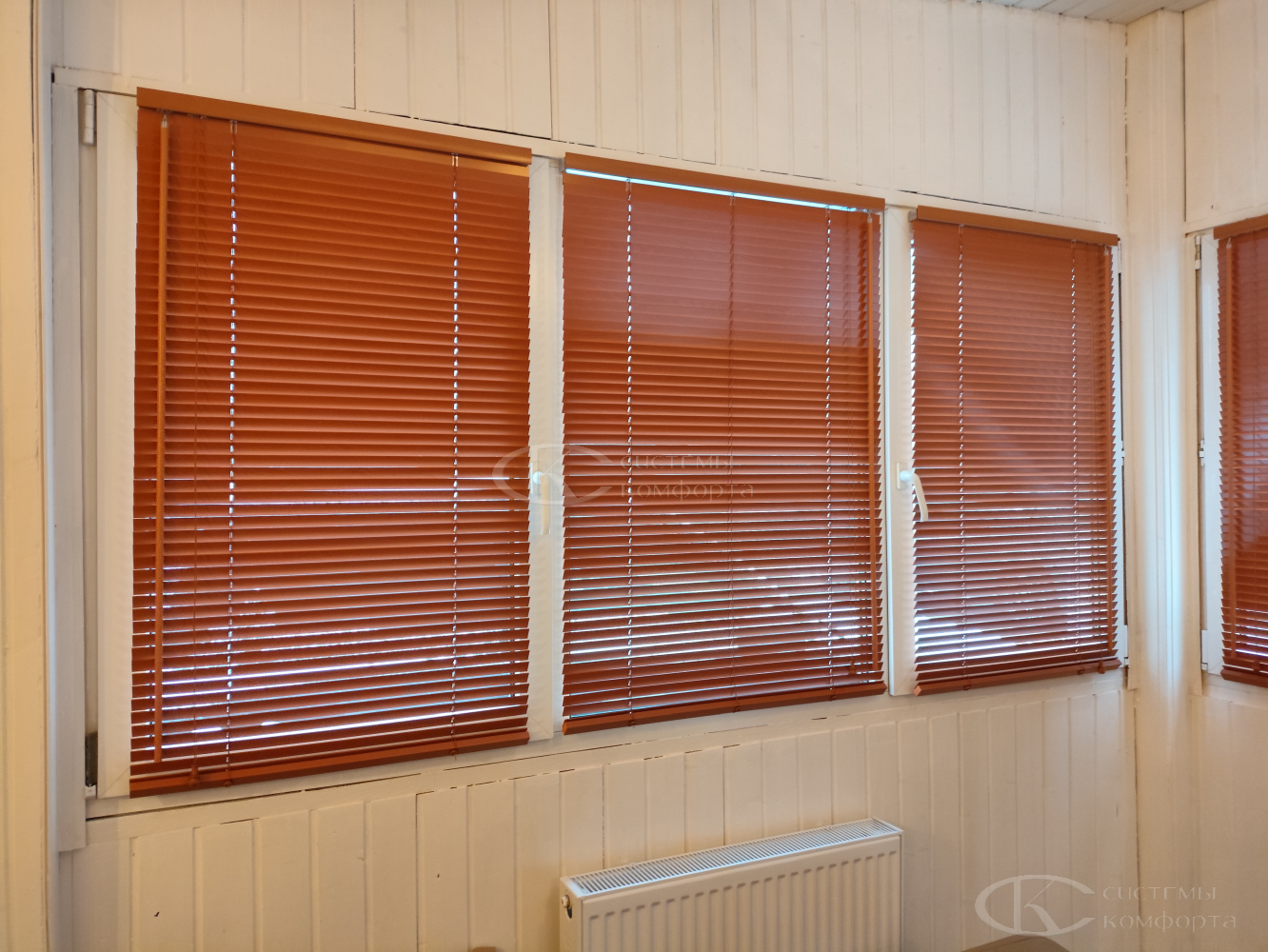 - Алюминиевые ламели. Самый популярный и практичный вариант для дома. Они невероятно легкие, не деформируются со временем, не выгорают на солнце и представлены в сотнях оттенков – от глянцевых белых и серых до имитации дерева (под дерево). Идеальны для кухни, где важна устойчивость к перепадам температуры и влаги, для мансардных окон, где нужна легкость конструкции, и для пластиковых окон в технических помещениях.